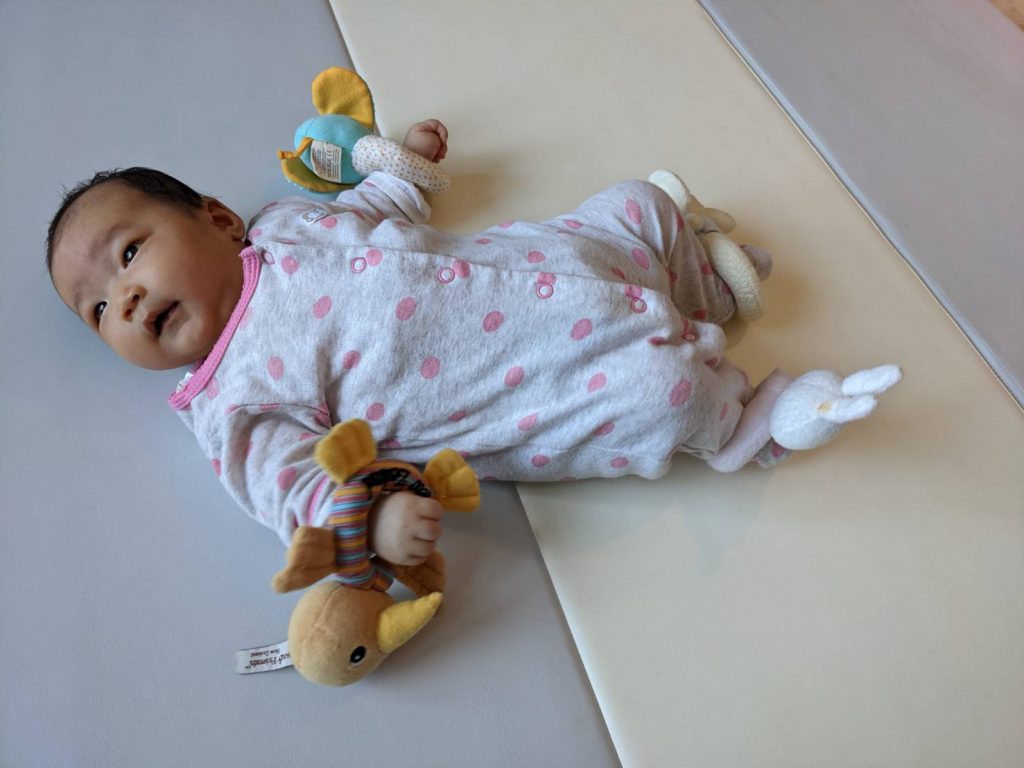 兩個月後的寶寶抓握反射漸漸整合,更常出現打開手掌且可不經意地抓住小手帕等,代表寶寶已開始慢慢從反射動作進步到主動抓握的能力。