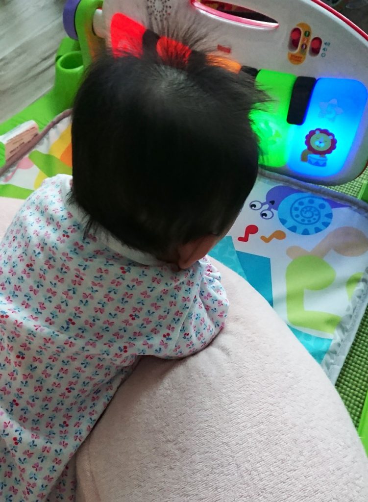 此時的難度會比讓寶寶直接趴在地上簡單很多,讓寶寶很容易出現小幅度的抬頭動作。