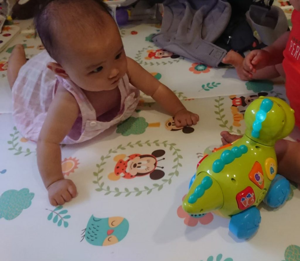 此時利用會移動的聲光玩具、車子,或是和寶寶一起趴在地墊上,增加寶寶抬頭看看的動機,都是很適合練習趴姿與頭控的方式。